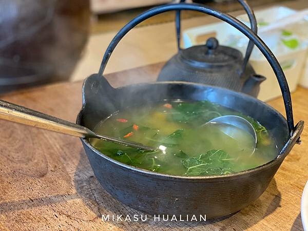套餐內容就到野菜湯為止,我把野菜湯放在這讓大家比較能清楚一點看到,野菜湯超大一鍋,裡面有不知道什麼菜的一堆菜、枸杞與滿滿的小魚乾,抱歉那個菜我還真的認不出是什麼,湯喝起來其實就是一個蔬菜清湯的感覺,加了超多小魚乾增加風味,喝起來就是鹹鹹的、很清爽,感覺很營養(?)有朋友覺得苦苦的,但其他人比較沒感覺,唯一的缺點是小魚乾我不愛吃,挑的有點痛苦。