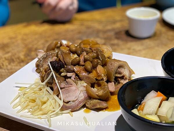 不知道單點是多大一份,不過合菜的份量覺得還不錯了,上面的花生超好吃!很綿密,配上豬腳的滑順口感超搭,口味上不會非常重,我覺得味道是適中的,吃的到一些中藥香氣又不至於會讓人反感,豬腳肉保有豬肉原本的味道,不用沾醬卻也不會覺得單調,吃起來很順口,但我吃口味比較重一點所以後續都沾雞油吃(微笑)