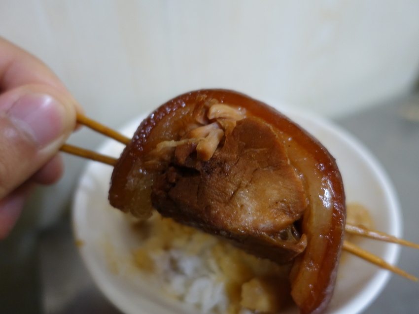 與其他縣市的焢肉飯不同,彰化焢肉飯一定會插著竹籤,深怕端上桌前不小心手滑,就已將燉到極致的焢肉肥瘦分離。