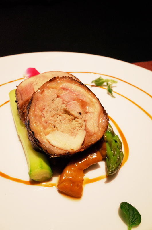 金黃玉米雞肉捲,牛肝蕈,蘑菇,蘆筍佐小牛醬汁