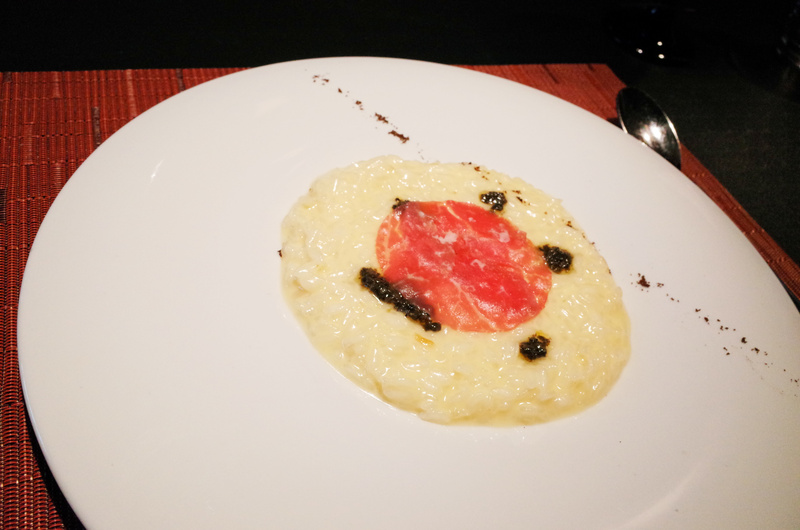 義式起士燉飯佐咖啡粉,季節新鮮黑松露,薄切生牛肉