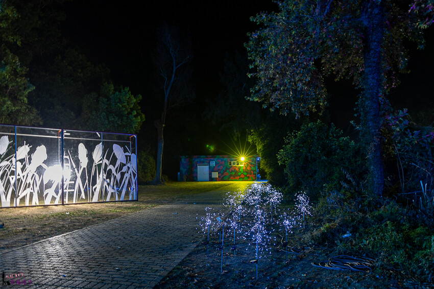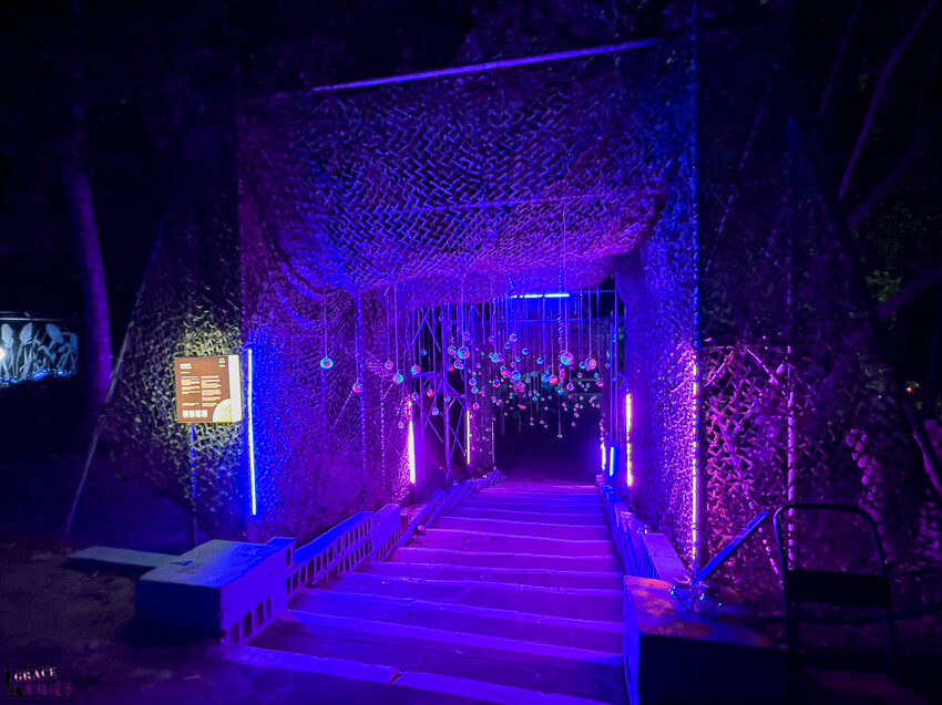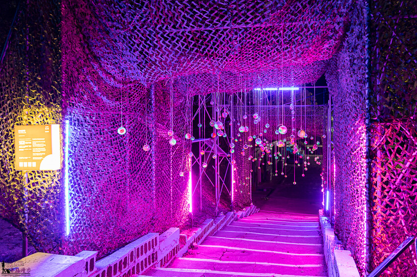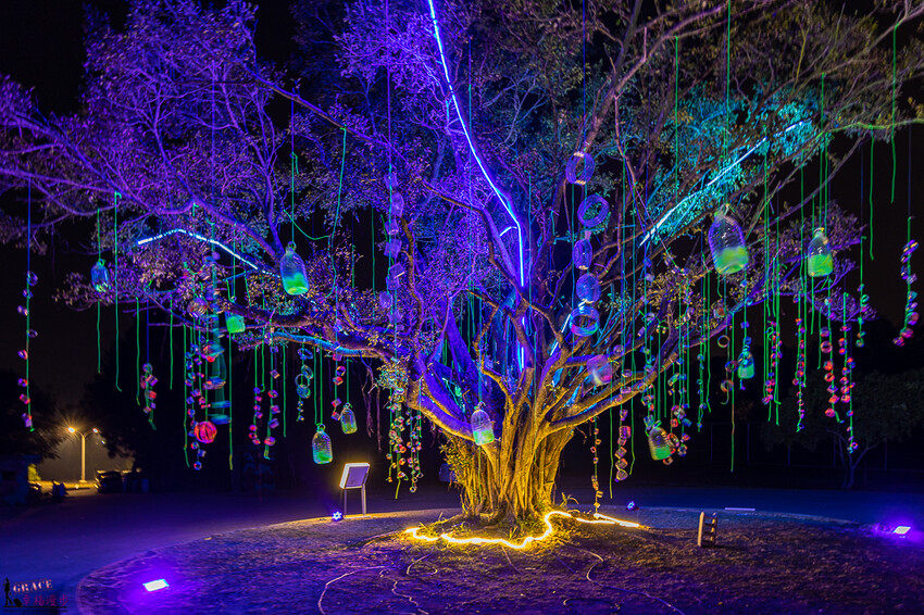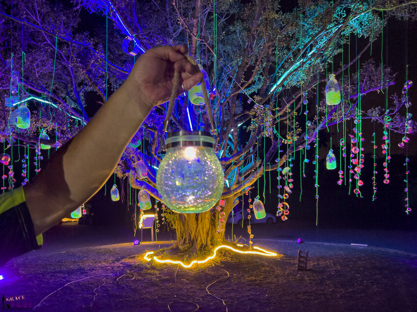 抵達營區後就種踏入星際之旅的感覺,會經歷空間上的轉換與跳動,首先會看到地球之簾,西洪營區的巨大樹木上掛滿了回收的寶特瓶,金門的小朋友在上面彩繪,就像是每個小朋友許願,把他們的願望掛在樹上,最下方黃色燈光的部分是金門島的形狀,意思是在金門島上長出了一棵希望之樹掛滿了所有小朋友的夢想,整個超有意境的。