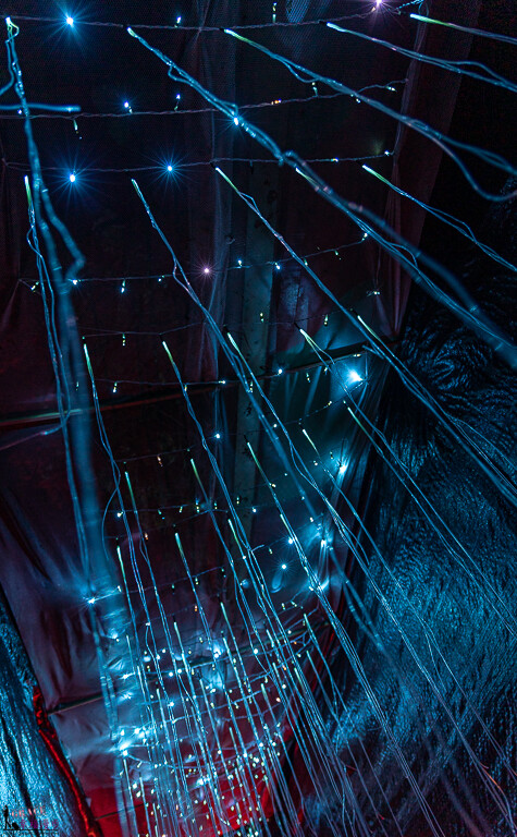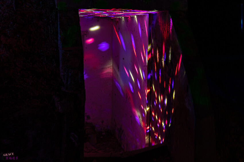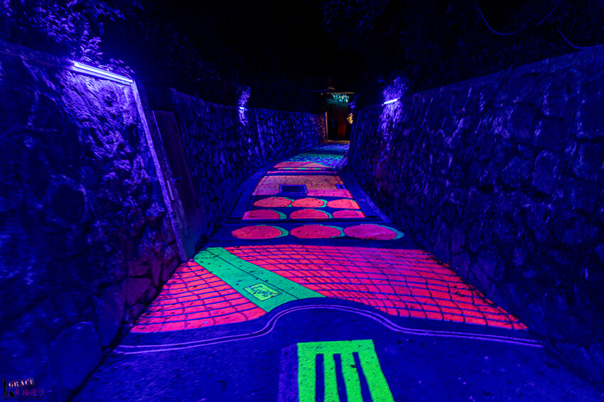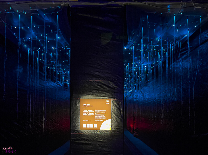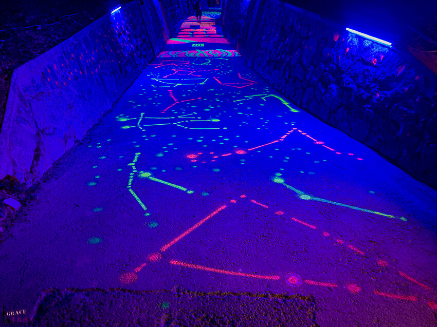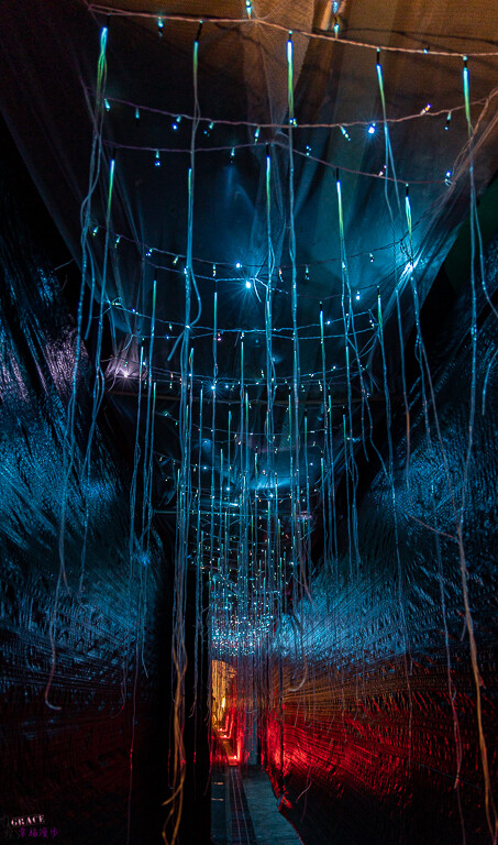 光纖裏道,整個設計概念是沈浸式的空間設計,猶如置身於星際中,在黑暗中一串串的光纖燈管就如同流星般,又像是下雨的星星,迷幻又浪漫的氛圍。