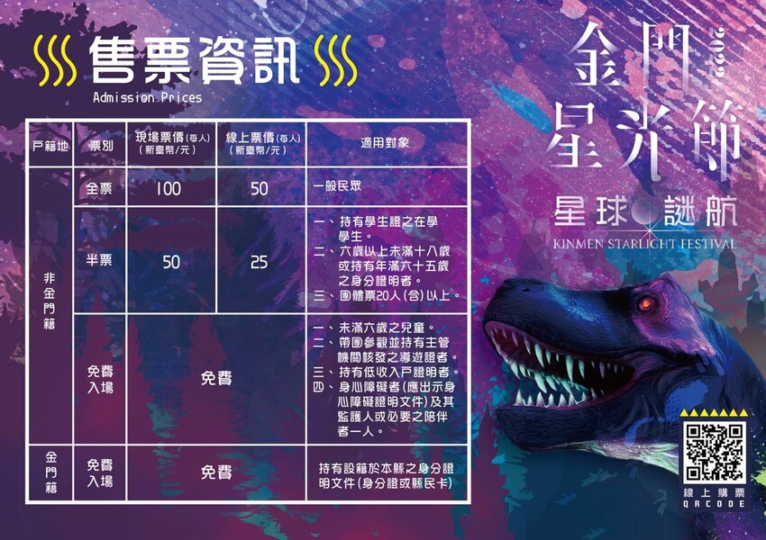 2022金門星光節是8/1~9/30,從晚上17:30開始入場、最晚入場時間是20:20分,金門鄉親持身分證可以免費入場喔!圖片取自官網