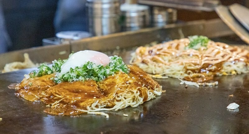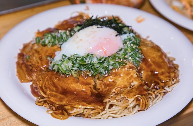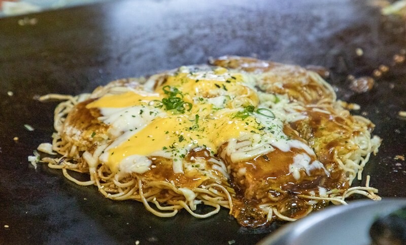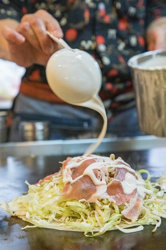 不知道大家知不知道大阪燒和廣島燒的分別?簡單說就是大阪燒會把所有食材都丟到麵糊中攪伴再放上鐵板煎,而廣島燒是如果這張照片般一層一層疊上去,吃起來各種食材的口感、味道會相對明顯,海苔、多福廣島燒醬汁、蛋、麵、豬肉、豆芽、蔥(在廣島一定用廣島蔥)、炸天婦羅屑(一包一包的)、高麗菜、調味麵糊。
