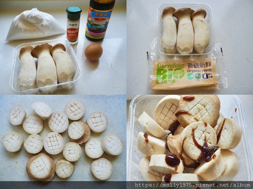 1.杏鮑菇切塊+調味料,醃製1小時。