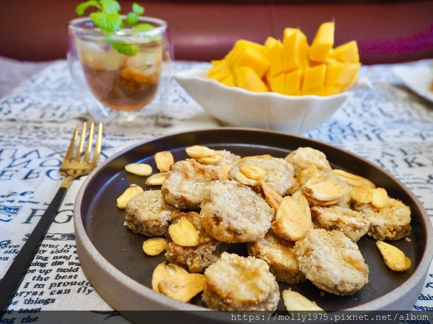 第一次吃素食鹹酥雞,就是用杏鮑菇切塊來代替口感相似的雞肉,尤其撒上鹹酥雞椒鹽整個無違和感,整個爆炸好吃。