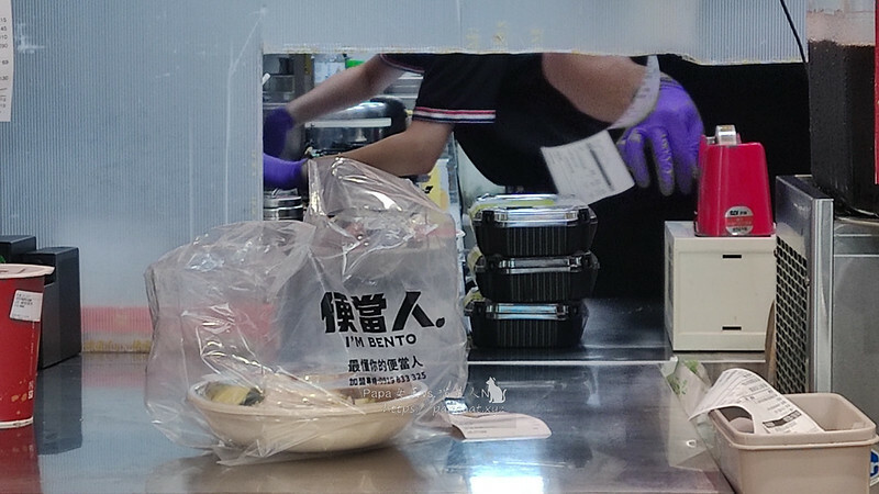 便當人 ,店名很可愛,一看就知道是賣便當的…少見的古風招牌裡外都很中國風 生意很好…11點左右PA驅動我的2條腿走過來就看到餐點台上已經有一排出貨單等待中,〞這回跑來這裡是因為發現有蔬食便當(五辛素)可選擇耶,就一種『 三杯杏鮑菇 』口味