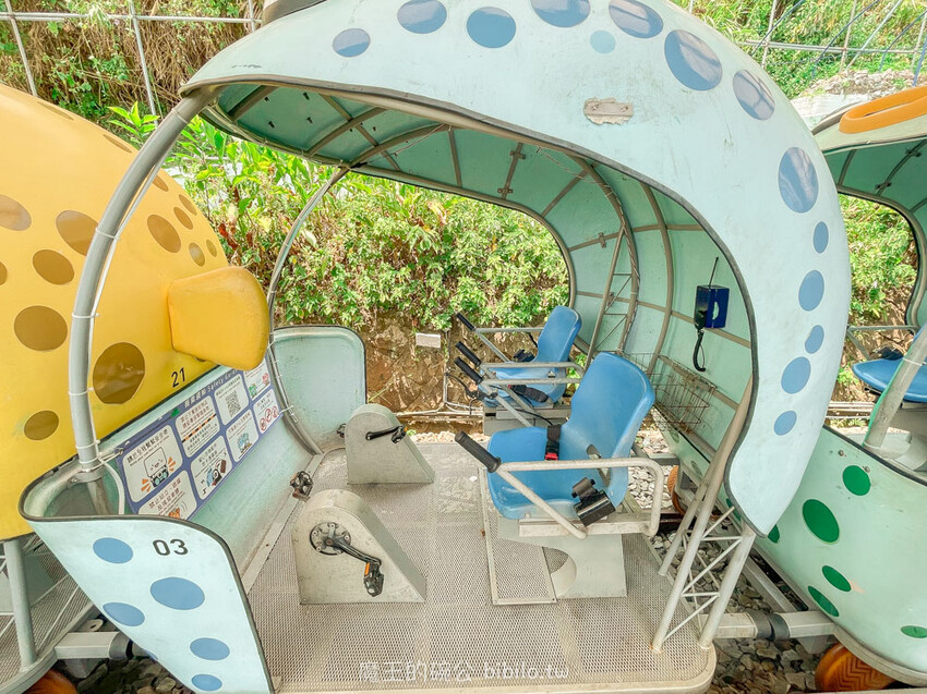 是一隻隻彩色的河豚車,顏色上無法選擇,排隊則是採兩人一列,依序前進,所以你是什麼顏色的河豚車真的無法選,因為在騎乘過程中,根本不會去注意自己河豚車的顏色,光是要拍照,欣賞沿途風景,還有要踩腳踏車,就夠忙的了,依序入座後,安全帶一定要扣緊,有帶小孩的也請將小孩安全帶扣緊,車子上有附置物籃,物品都要放在籃子,然後車子不是全部連接在一起,一律都是人工踩踏,每一輛車需跟前方車子保持5公尺距離,以策安全。