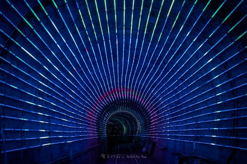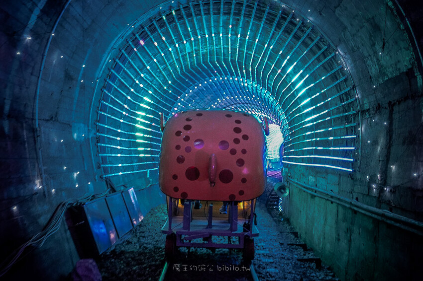 隨著鐵道慢慢騎,會進入光雕隧道,這是白天與夜晚都會有的裝置,一聽去會聽到宛如像在海洋裡的音樂聲,我覺得是鯨魚的聲音,樂哥說是鬼聲,真的很沒氣氛耶!哈哈,光雕會隨著音樂光影變化,真的很像在海地世界一樣,而且也因為是隧道,所以非常涼爽。