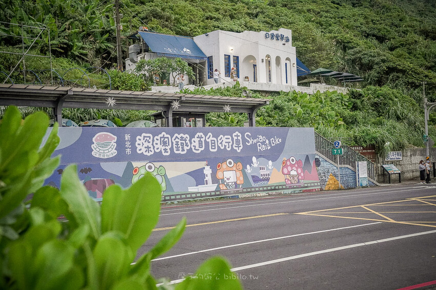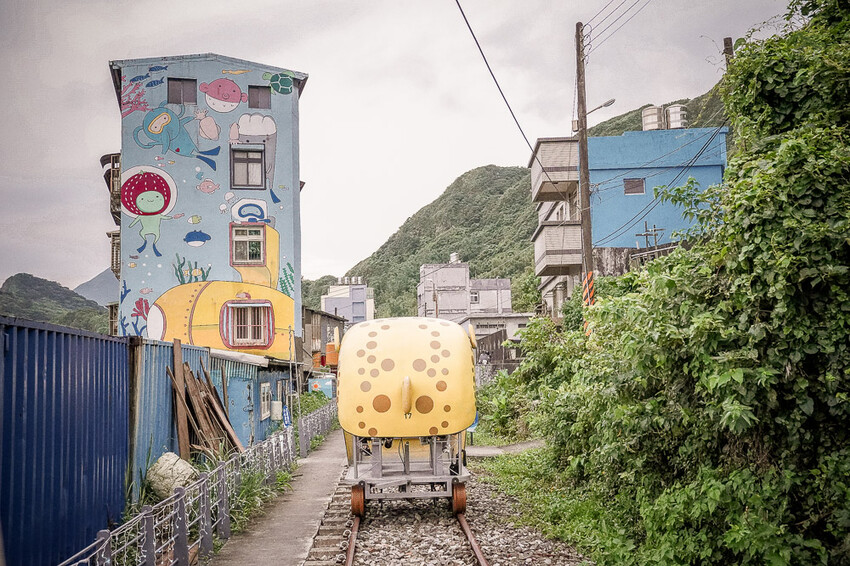 深澳鐵道自行車全長1.3公里,前段是知名插畫家.毛毛蟲的插畫x深澳鐵路自行車,從門票到文宣以及周邊建築彩繪都是插畫師毛毛蟲裡頭的角色,像是豆腐君/象鼻君/山野君,喜歡可愛萌趣插畫的人,真的要拍一波。