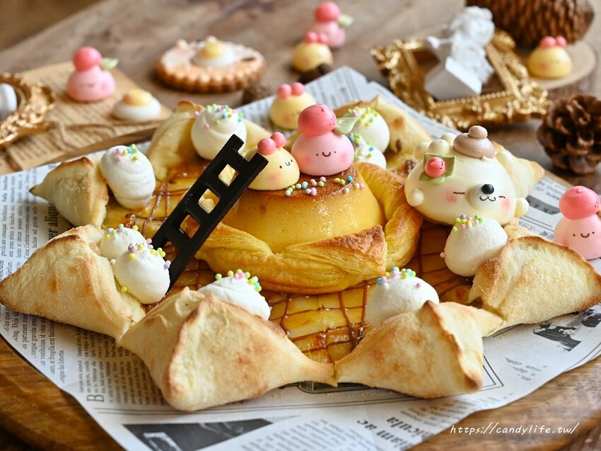 這款酥皮烤布丁熊熊派對披薩還有個亮點,就是裡頭的可愛手工馬林糖,瞧瞧這隻正在沉睡中熊熊是不是超可愛的呀
