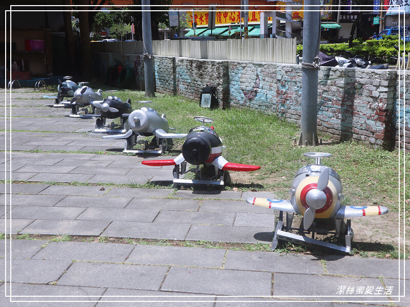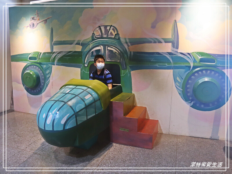 廣場這排小戰鬥機也好可愛,是真的可以讓幼兒登坐唷——不過飛機不大,有限重,少爺已遠遠超標坐不下了XD,只能蹲在旁邊拍照啦😆😆。