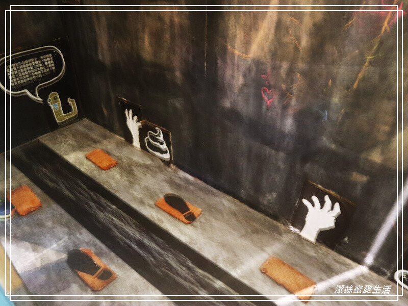 打開廁所門也很有趣!是早年傳統的一條溝式的廁所,現在孩子應該都沒見過了,還畫上了腳踏的位子XD,幽暗全黑的牆壁,若是半夜一個人來上廁所肯定會覺得毛骨悚然😂。