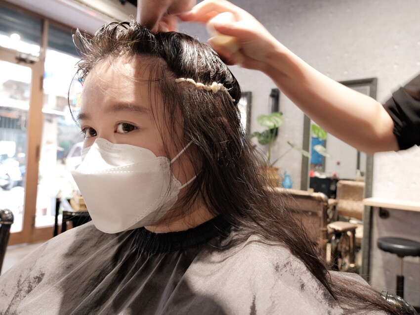 設計師在用瞬間護髮,邊停留、邊把頭髮梳直,