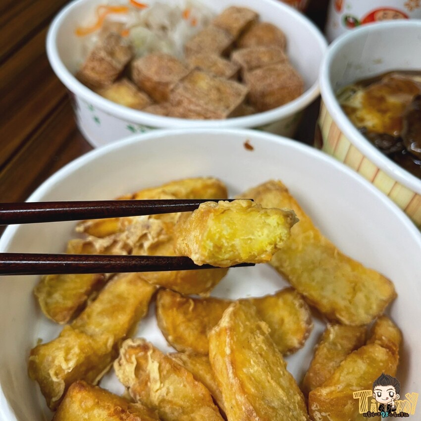 黃金地瓜條(50元),地瓜切塊下鍋油炸的金黃酥脆,沾點甘梅粉風味更佳喔。