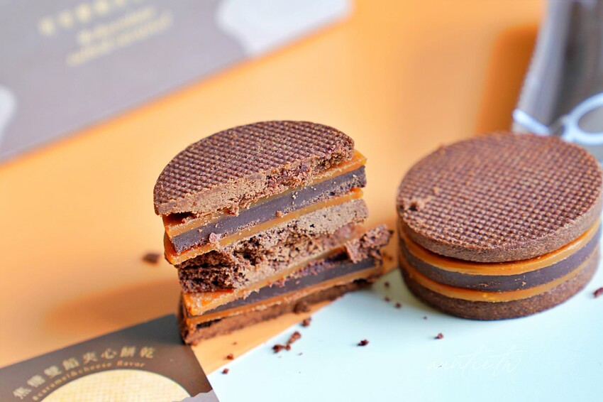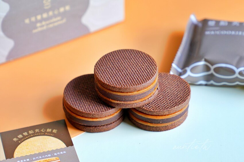 不得不說,這款雙餡夾心餅乾真的超邪惡,使用普羅法國粉、法國可可粉以及慢煮焦糖著作,巧克力餅乾加上焦糖、可可粉,咬下去是脆口香濃,口感味蕾濃上加濃,甜度偏高一些,但是搭配茶飲或咖啡剛剛好,口味跟口感都很有創意!