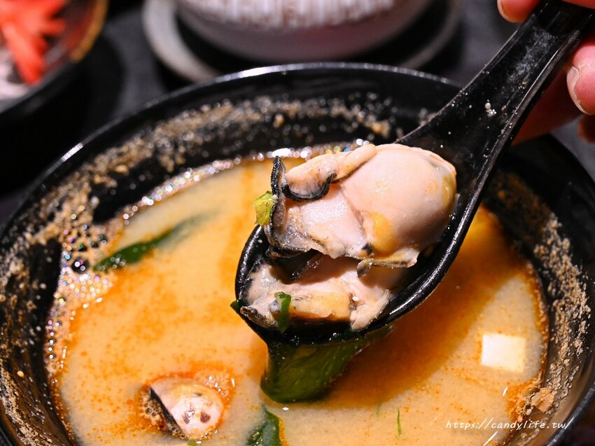 湯品的部分是生蠔蛤蜊味噌湯,採用蝦頭下去熬煮的味噌湯,所以裡頭才會紅紅的,用湯匙一撈,除了豆腐、蛤蜊,還有肥嘟嘟的大生蠔,鮮甜多汁,味噌湯也好好喝