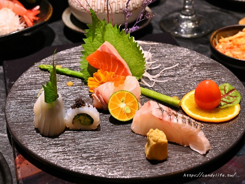 800元無菜單料理中的生魚片包含鮭魚、海鱺、旗魚及烏魚子花枝漿,魚肉生魚片都非常新鮮甘甜,裡頭最特別的就是烏魚子花枝漿,在外面比較少見,Q彈的花枝漿包入烏魚子,除了花枝漿本身的鮮甜,還多了烏魚子的獨特鹹香