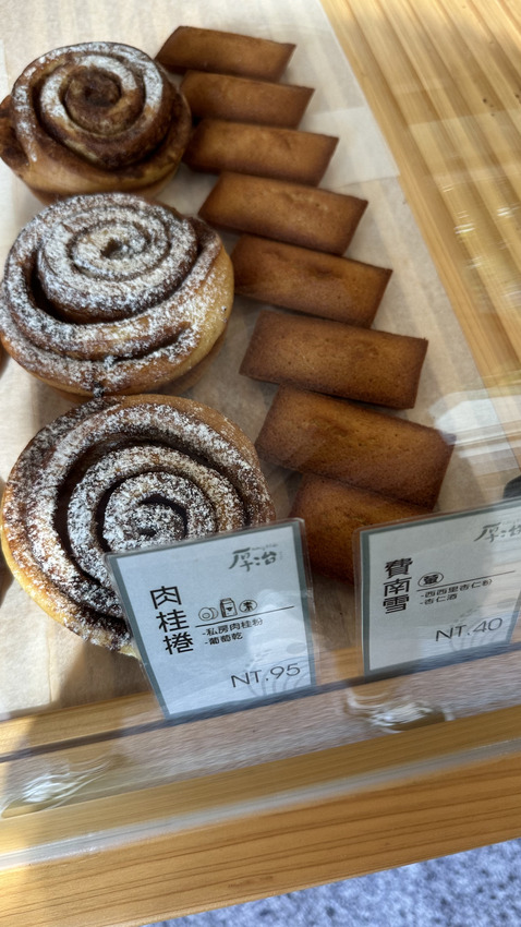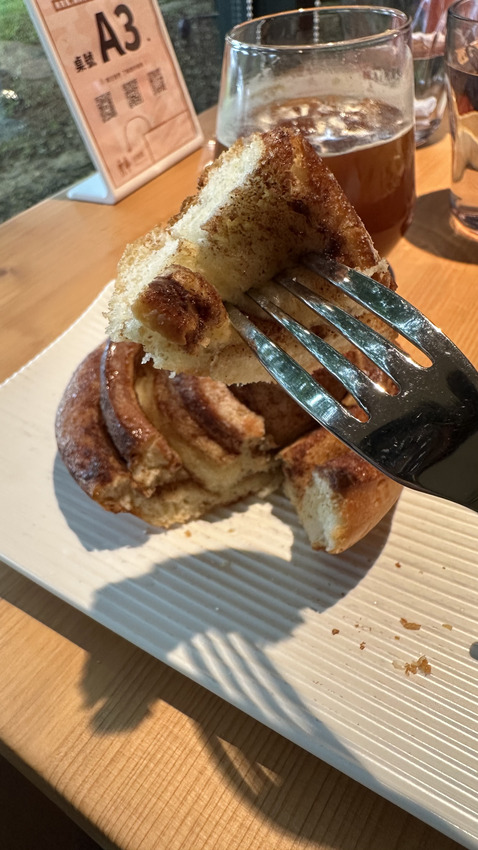 肉桂捲以溫度上來說就比較正常,也能順順利利的切開,飄出的肉桂味中規中矩,只是咀嚼的過程中以麵體感為重,比較不是我所愛的流派,久久想吃的話也許會再回來買。