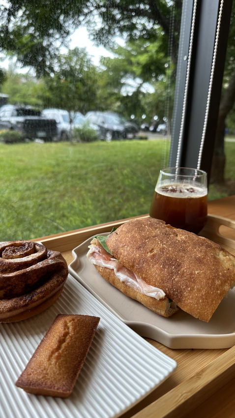這次點了義式帕瑪三明治$180 + 美式(A套餐)$80、肉桂捲$95、費南雪$40。點完餐約莫5到10分鐘取餐鈴開始震動,如前所述因為沒有收服務費連餐點都要親自前往櫃台領取,小小一盤充滿著幸福的味道。