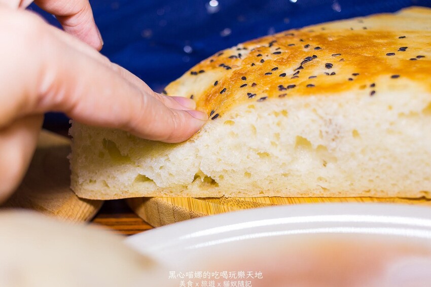 我自己是比較喜歡這種QQ彈彈的微甜軟式大餅,撕咬不用太費勁兒,咀嚼時散發出淡淡麵香,還有溫和柔雅微甜,結合表層黑芝麻香氣,讓樸實軟大餅也可以擁有三種層次的美妙滋味。