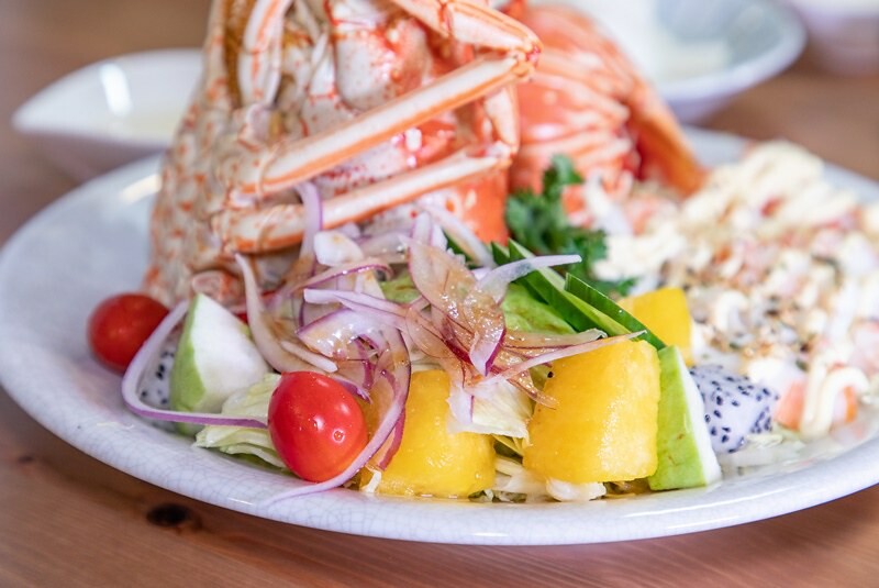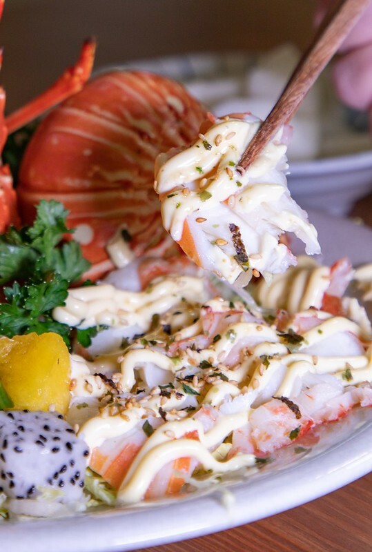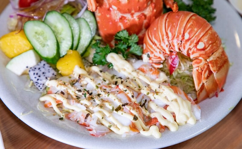 我發誓事先我完全不知道友人點了什麼..只記得她說有一些料理要先預約,當時我還心想市場還要預約什麼,難不成還能飛上天...。但吹著冷氣,舒舒服服坐著等了近十多分鐘後,居然出現龍蝦沙拉....價位是1200元,假日限定或是事先預訂才有。