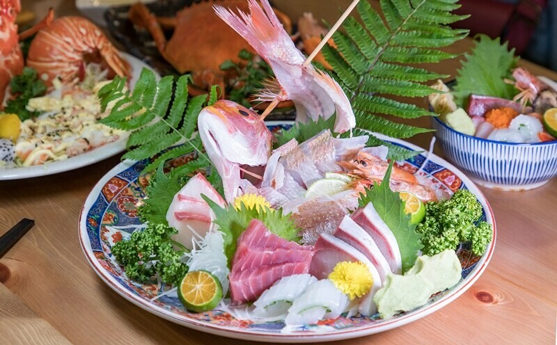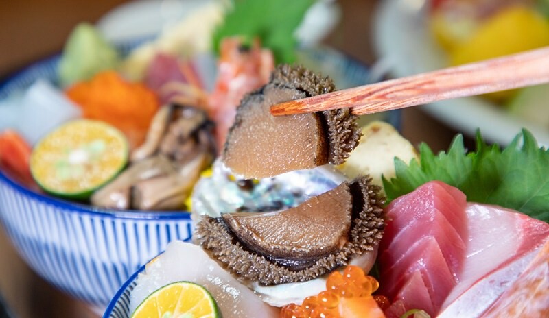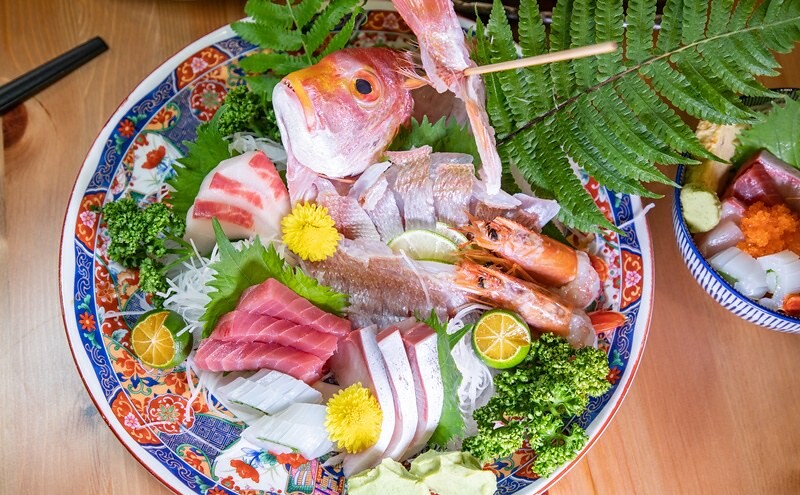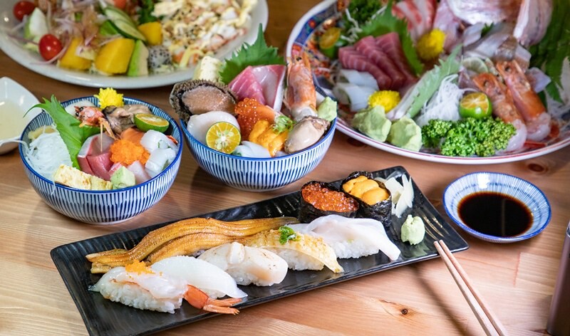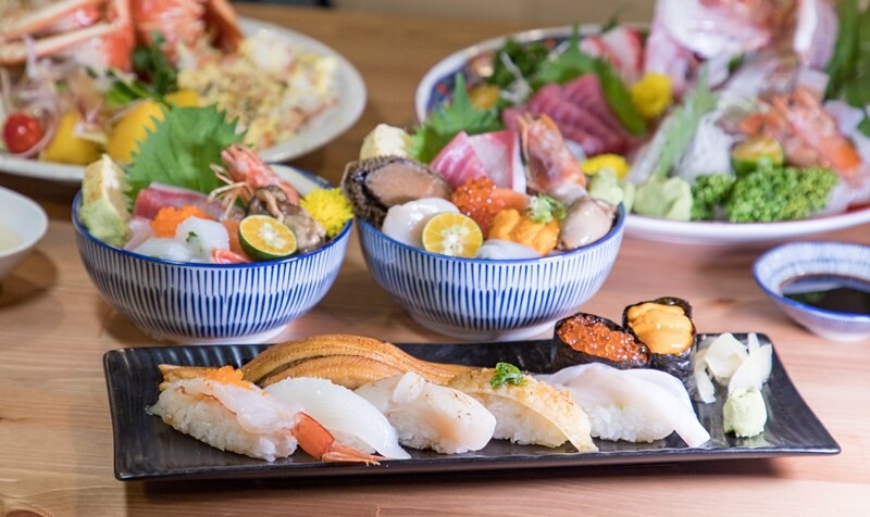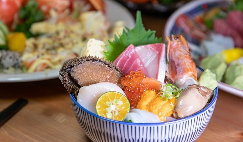 這裡的招牌是海鮮丼價位從基本款250元的神樂海鮮丼,到最貴600元的極上海鮮丼六種,另外還有三種炙燒海鮮丼。而這一份是600元的極上海鮮丼,上面舖好舖滿到看不到醋飯的食材約有十多種,光是視覺效果就讓人滿足。