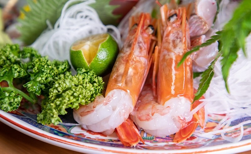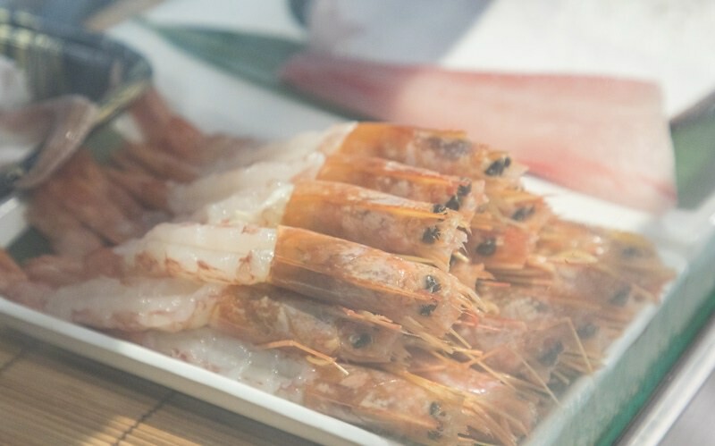 本來想拍玻璃櫃裡油花很美的生魚片,但冰櫃的霧氣實在太強了,但光看甜蝦就覺得食材相當不錯。