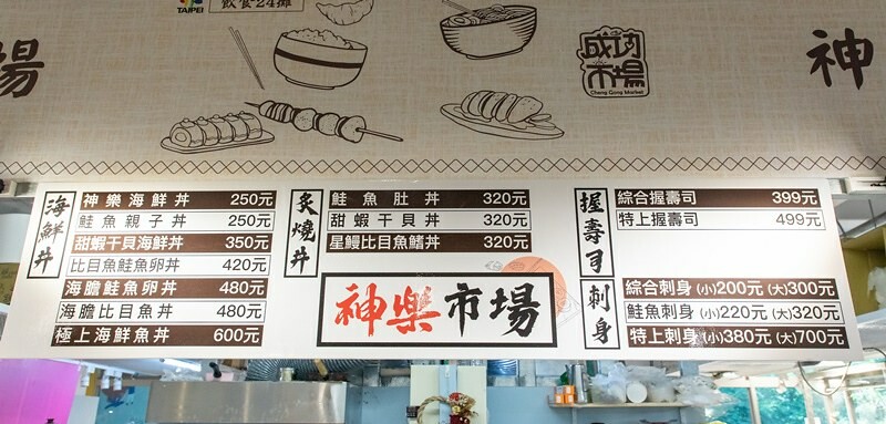 看了一下這裡主要是生魚片、海鮮蓋飯、握壽司為主,價位從250到700不等,不過看起來好像都是生食,友人說熟食可以去旁邊的神樂食堂點。