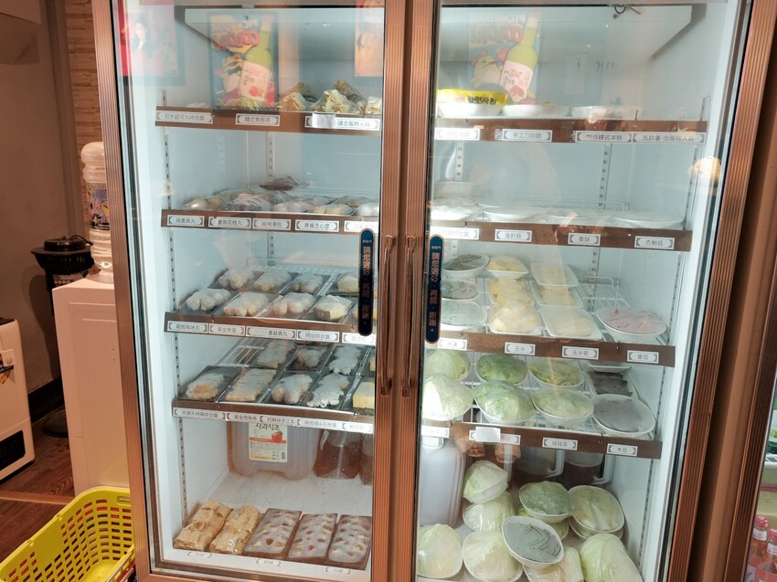 冰箱裡有韓式飲料、燒酒、火鍋料、菜盤