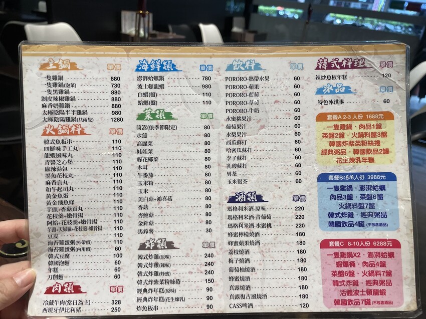 菜單有火鍋、雞湯、韓式小菜、海鮮等等