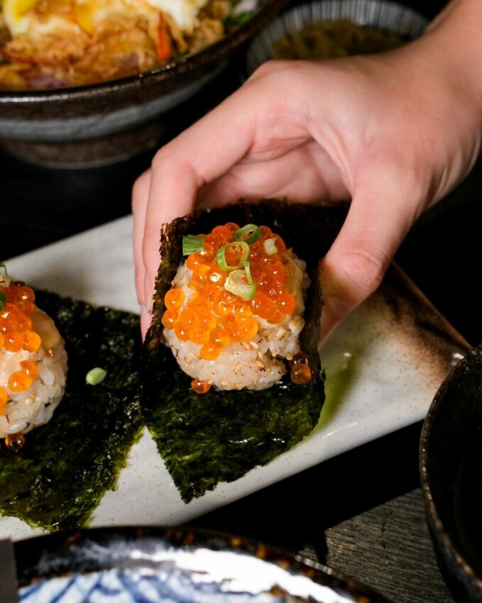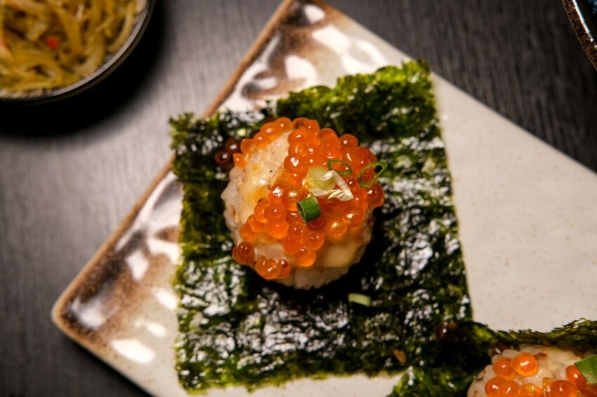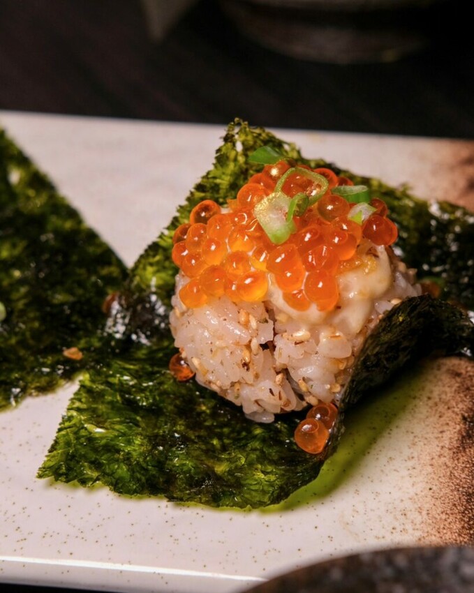 ▼視覺就超級厲害的鮭魚一口爆,將壽司飯包上酥脆海苔,淋點美乃滋再鋪上蒜片,最後毫不手軟加入滿滿的鮭魚卵,綿密鹹香又帶點濕潤的飯糰,吃的到美乃滋與蒜片的香氣,同時還有鮭魚卵的鹹香爆汁口感,清爽不油膩,超好吃!