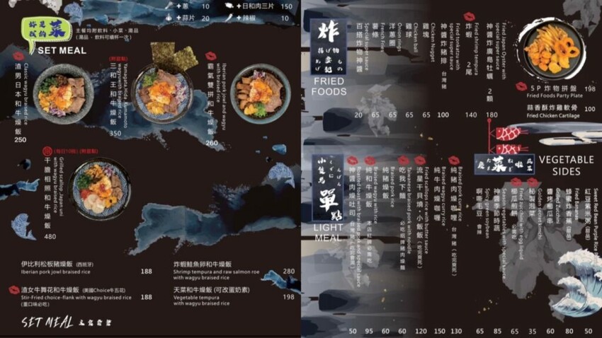 【渣女•深夜和牛燒肉燥飯】以招牌和牛燒肉燥飯為主打,還有更豐盛的海鮮雙拼口味,從開胃菜、咖哩套餐、小菜到炸物通通有,還有相當齊全的酒精及飲料品項。