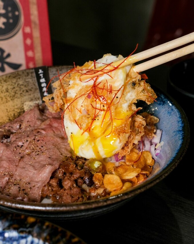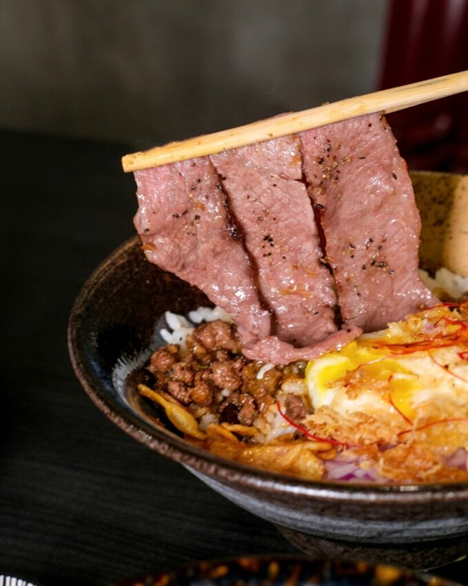▼牛肉控必點的渣男日本和牛燥飯,以美國 Prime 級牛肉燥為基底,鋪上山形 A5 和牛肉片、生食級荷包炸蛋、洋蔥、蒜片和蔥花,主角A5和牛柔軟好咬,帶有和牛細膩的油脂香氣,再輕輕劃破蛋液,讓香氣逼人的牛肉燥與米飯結合緊密,只能說真的是太銷魂了!