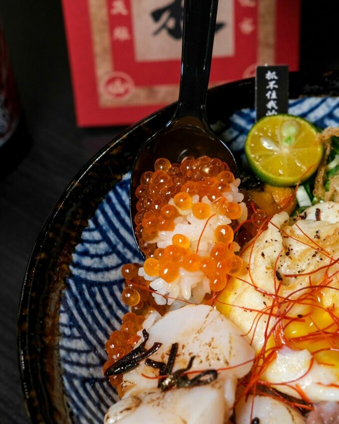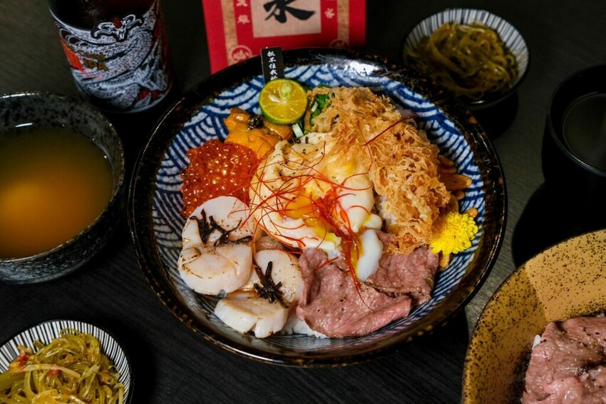 ▼每日限量十碗的干膽相照和牛肉燥飯,底下同樣有香噴噴的美國 Prime 級牛肉燥,再搭配海膽、生食級干貝、鮭魚卵和山形 A5 和牛肉片,一次帶來海陸四拼的層次爆擊,干貝軟嫩又鮮甜,海膽濃郁鹹香,混著鮭魚卵逼逼波波吃下更滿足~