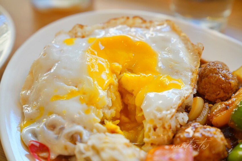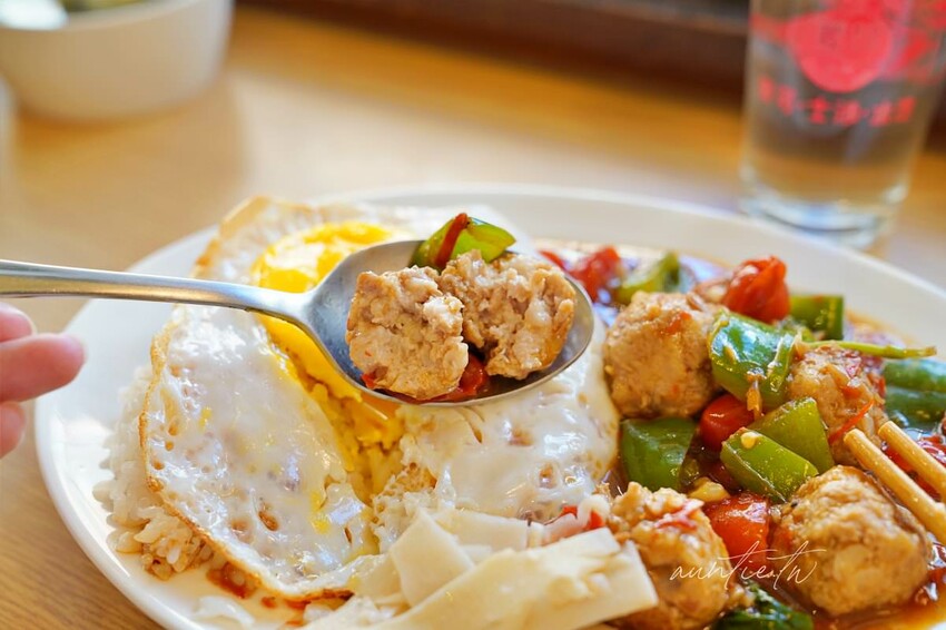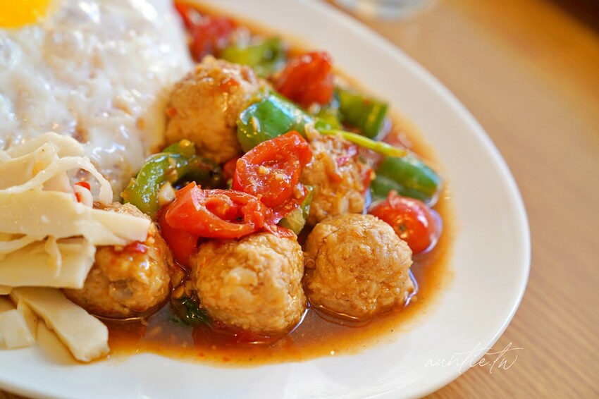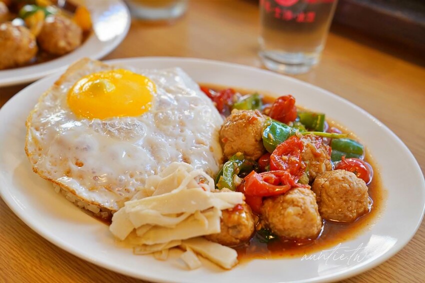 現點現做,點完餐就聽到廚房裡鍋子的翻炒聲,糖醋肉丸酸甜開胃,加了很多彩椒,肉丸吃起來不會有可怕的豬腥味,口感不會柴柴,搭配半熟荷包蛋,戳破跟白飯拉拉一起吃真的很邪惡。