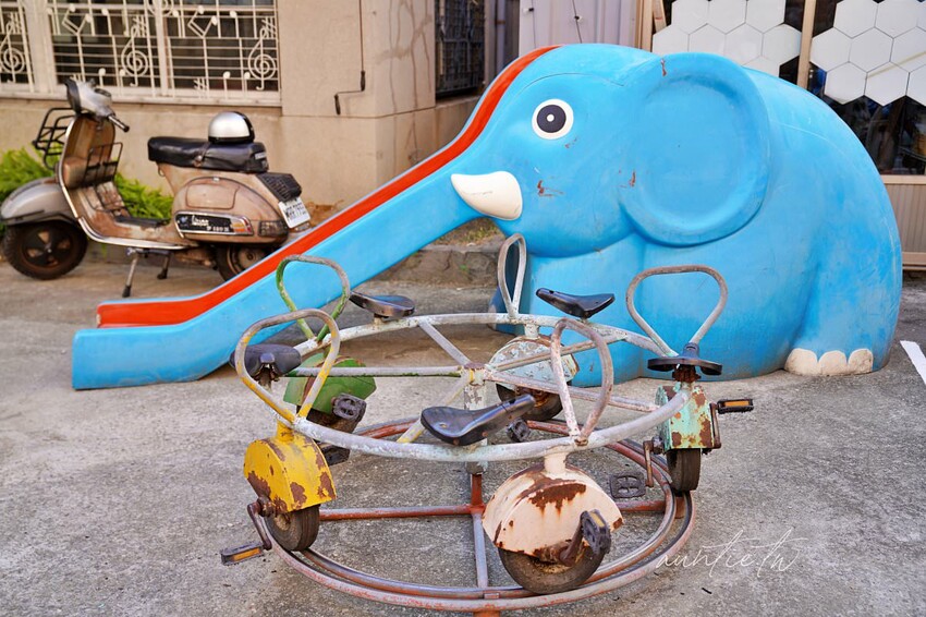 肉丸丁飯店二店的外觀很顯眼,除了有大象溜滑梯外,還有小朋友玩的轉圈圈的腳踏車,平常看覺得還好,晚上看真的有點毛毛😂