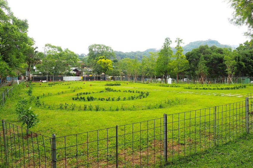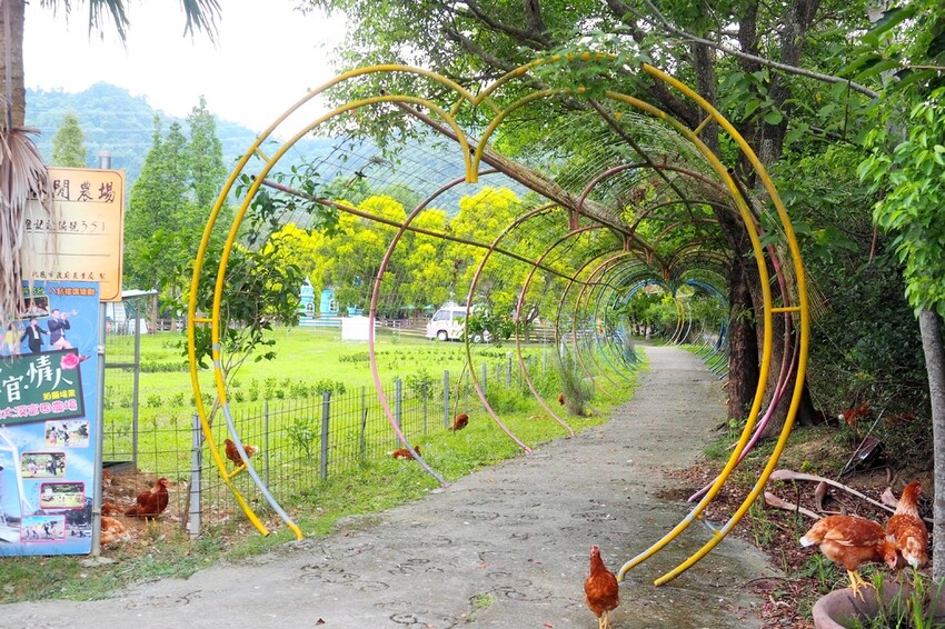 沿著右手邊的愛心步道往前走,一進門就有悠閒自在的雞群迎接我們