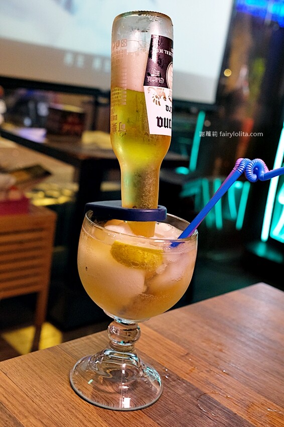 把啤酒反插在瓶子上,別看照片好像小小一杯,但本人size根本超大,足足就有1公升的容量,也許造型現在來看已經不是太稀奇,但在酒趴還是相當受歡迎,主要是杯子裡面用的是調酒、而不是常見的果汁,喝起來甜甜的、還有冰沙帶來的沁涼感覺,只是尾勁有點強,喝了還是會醉的呦!XD