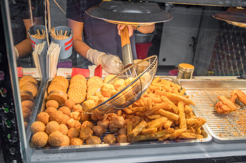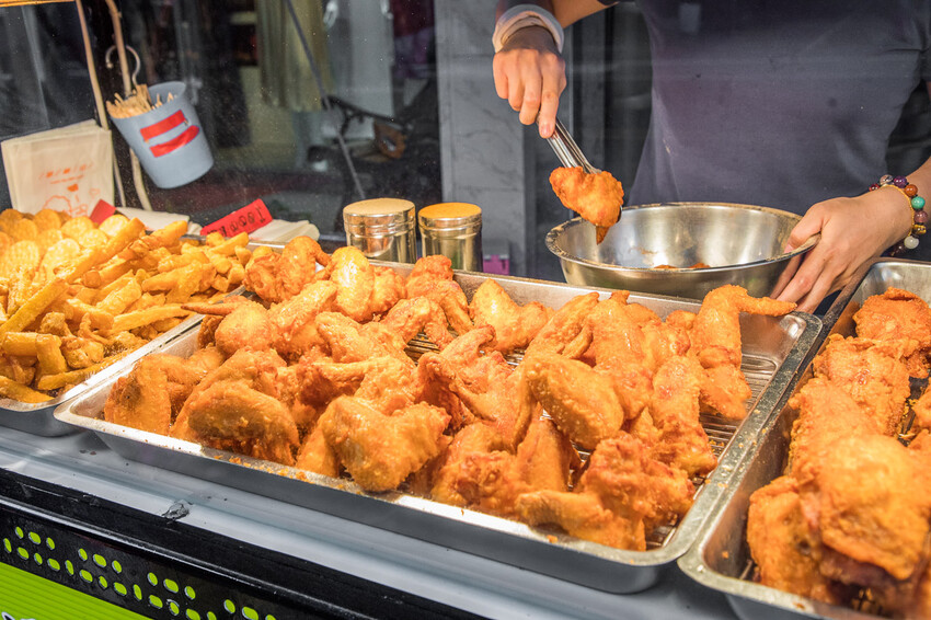 巷口湯翅內壢店下午兩點開始營業,老闆這時候就開始炸,客人也陸陸續續上門,客人最多的時候應該是下班時間,玻璃櫃裡還有用鹵素燈保溫,炸物們也都整齊堆放,不過停留的時間都不長,一下就被買完了