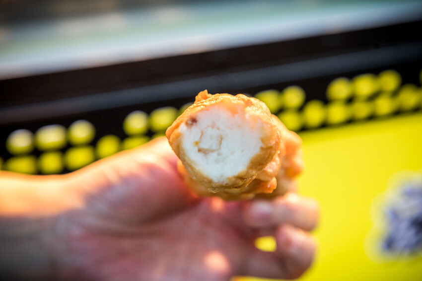 花枝丸,一份是四顆,這裡的花枝丸是有花枝塊的那種,花枝丸本身是比較軟Q的那種,加上花枝塊Q脆口感,很有層次感