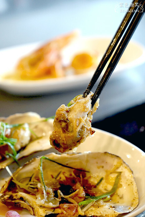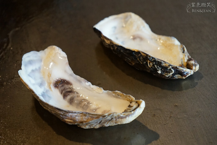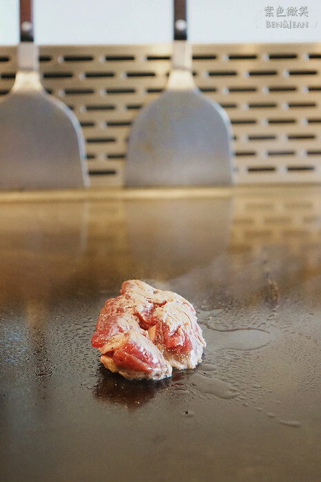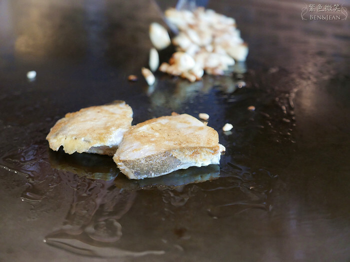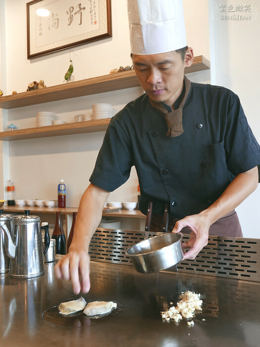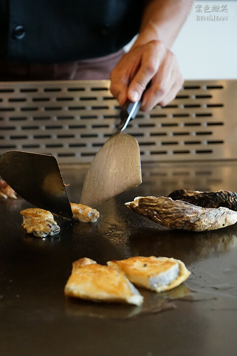 因為這裏是鐵板燒,所以不是吃那種加了檸檬汁就可以生吞下肚的,廚師一樣放在鐵板上,當放上鐵板的那一剎那,滋~~~的一聲,啊,多美妙的聲響啊