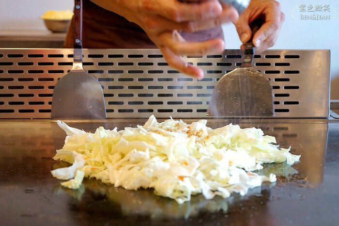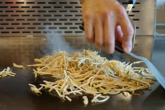 來吃鐵板燒,當然就是要坐在檯前,欣賞師傳鏗鏗鏘鏘、煎鏟交錯此起彼著的聲音,加上俐落的手法,將食材在適當的時間端上桌前呈現給客人,而且保證趁熱吃!