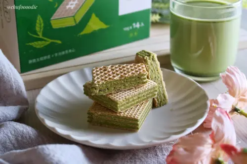 選用五穀粉製成的餅皮,搭配日本的宇治抹茶,重抹茶威化餅相較於巧克力吃起來比較不甜,微微的苦澀與茶香,完全不會膩口
