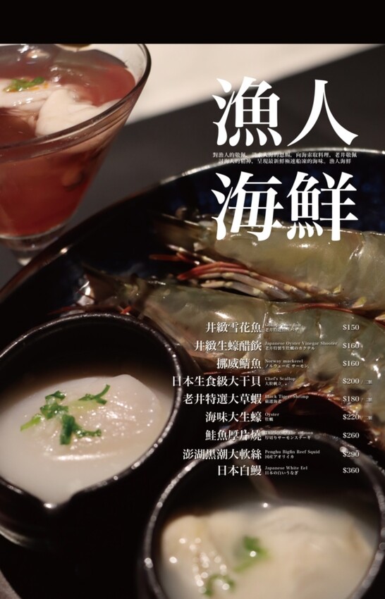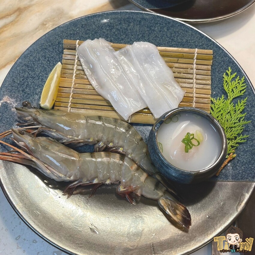 套餐還包含海鮮,有生食級大干貝/生蠔/澎湖黑潮大軟絲/生蠔醋飲 4選1,及海味大草蝦。