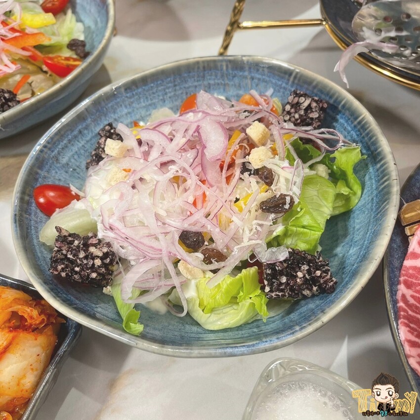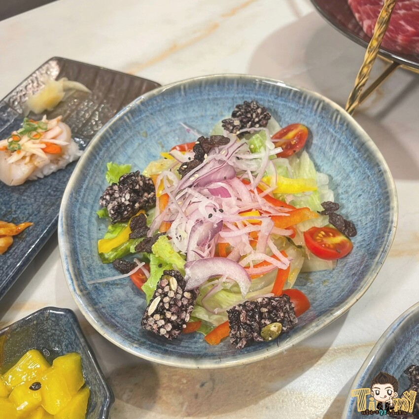 五顏六色的沙拉加上和風醬,口感清爽又開胃,特別的是還加入了巧克力米菓增添口感耶~