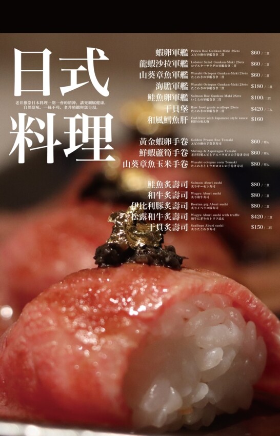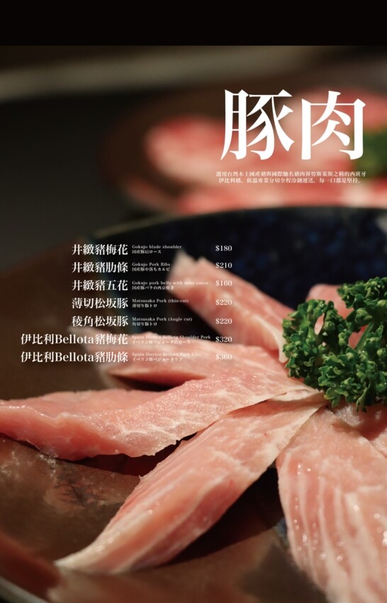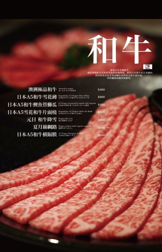 紐西蘭牛舌佐洋蔥丁、安格斯反手拍、安格斯厚切牛、安格斯手切金磚燒、澳洲極品和牛、日本A5雪花和牛片面燒、松坂豚。