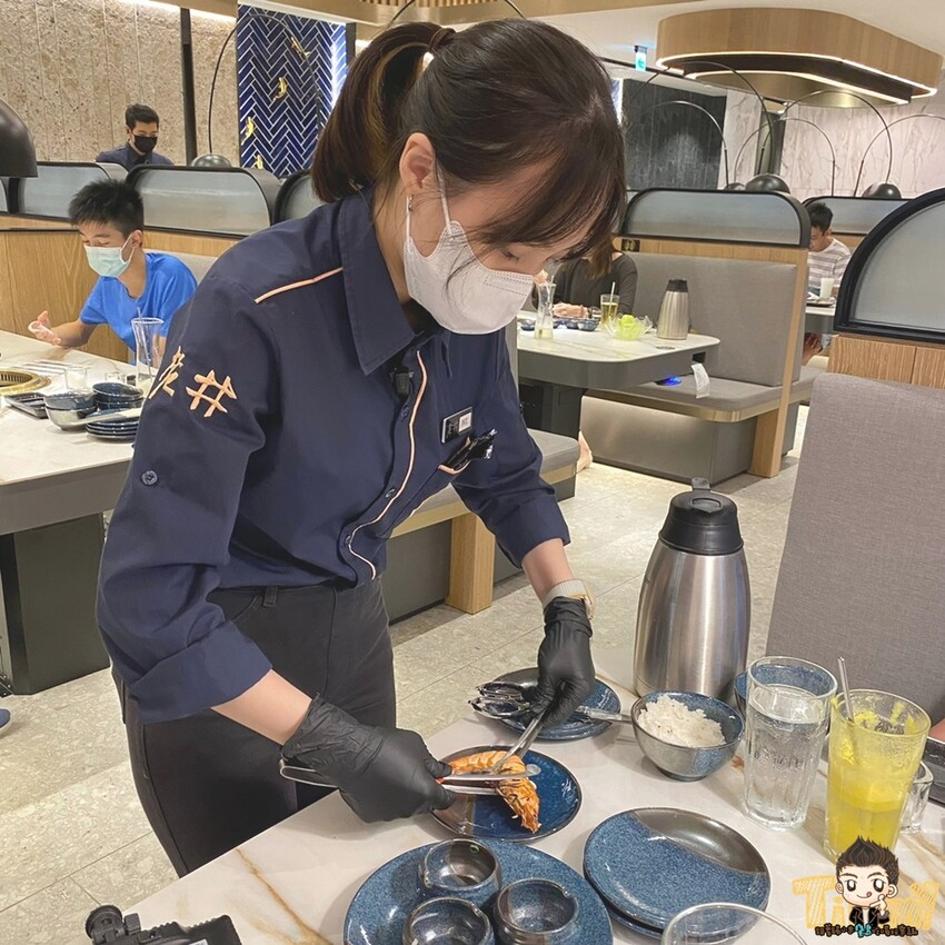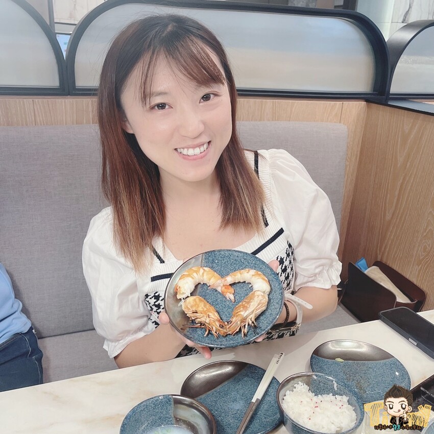 草蝦由店員幫忙代烤,他還會用雙夾剝蝦,並排成心型喔