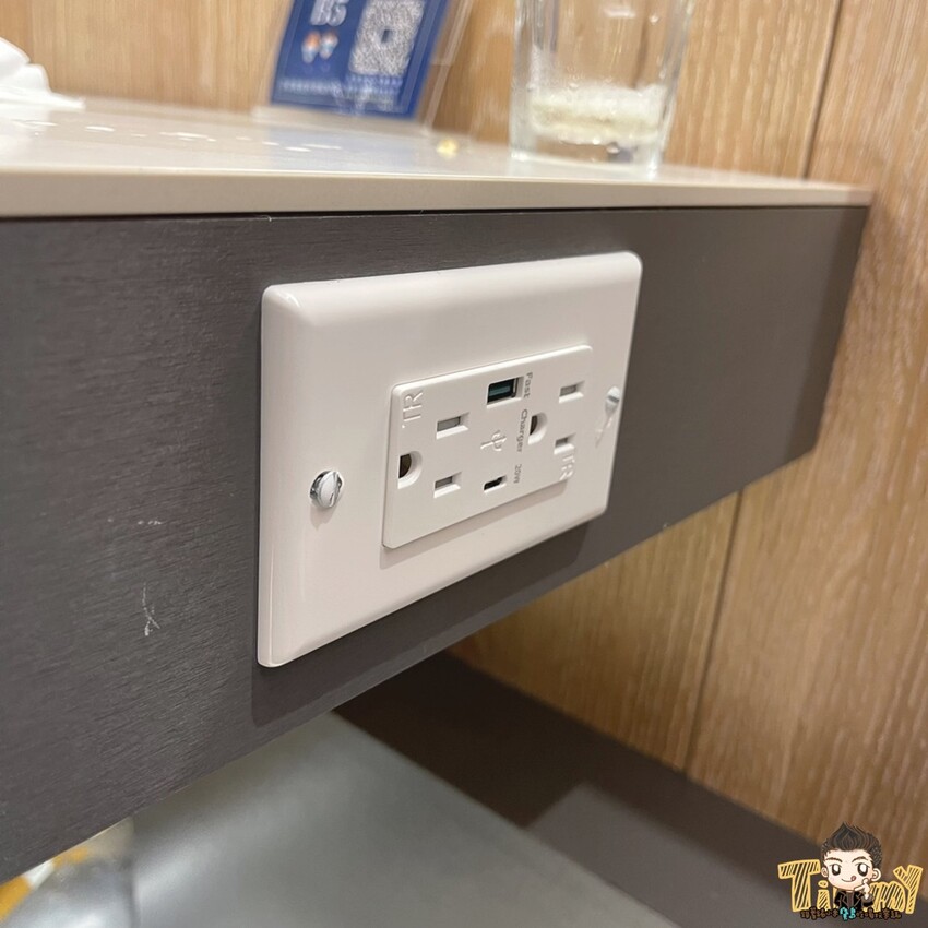 桌子抽屜拉開有紙巾、牙線棒,也附有充電插座、USB插座,不用擔心手機沒電